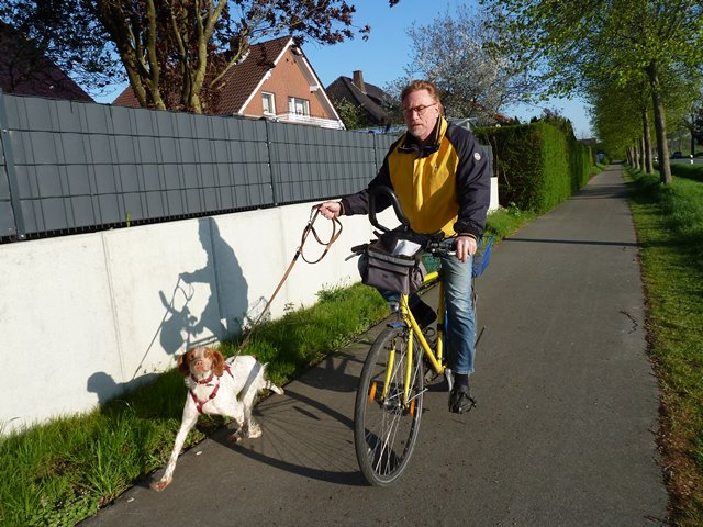 Wenn uns Kumpels begegnen, muss ich mich auch zurückhalten. Ich darf nämlich nicht die Seite wechseln, dann schimpft er gleich. Also lauf ich einfach weiter. Dann treffen wir auch noch Frauchen! Sie ist auch auf dem Rad unterwegs. Wior fahren dann gemeinsam nach Hause. Kerl, war das ein schöner Ausflug! Das möchte ich jetzt aber bitte öfter haben! Ich geh‘ einmal zu ihm und sage extra Dankeschön!